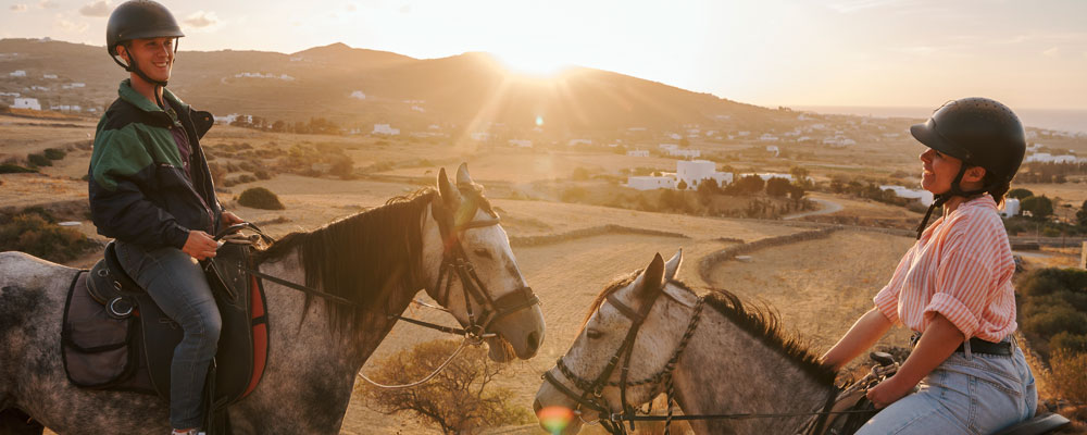 Ανακαλύψτε τη μαγευτική ομορφιά της παριανής υπαίθρου στο ηλιοβασίλεμα, με τις εκδρομές ιππασίας μας και την καθοδήγηση έμπειρων ντόπιων οδηγών. Αυτή η μοναδική εμπειρία προσφέρει μια άλλη οπτική της υπαίθρου και της φύσης της Πάρου. Ξεκινώντας από την Κακάπετρα, ιππεύουμε με τα άλογα, σε κρυμμένα μονοπάτια για να παρακολουθήσουμε παρέα το εκπληκτικό κυκλαδίτικο ηλιοβασίλεμα.